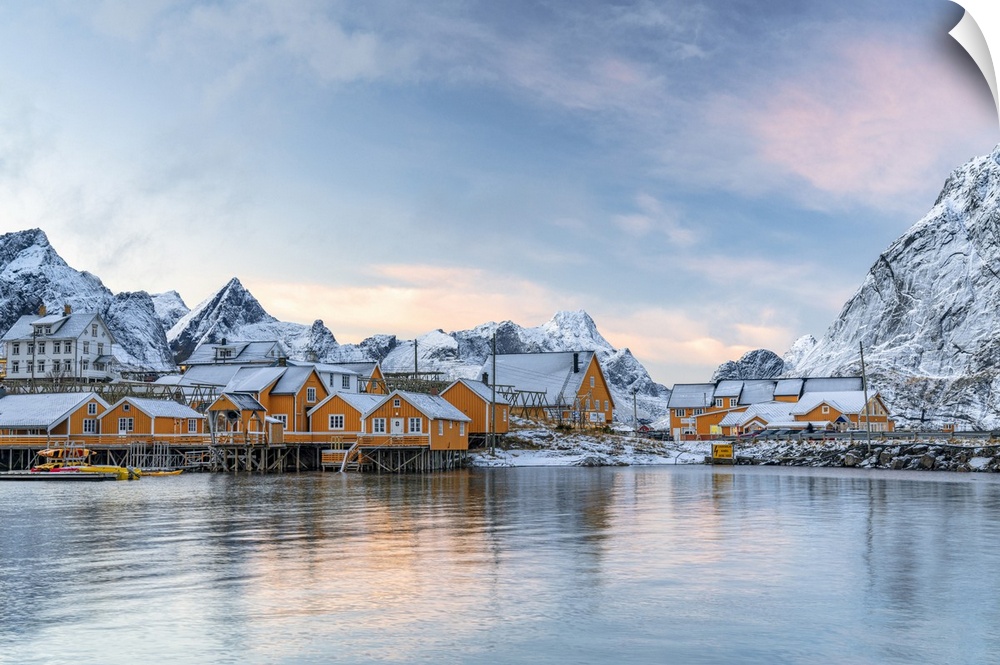 <p>Fishermen's wood cabins covered with snow at sunset in the tiny village of Sakrisoy, Reine, Nordland, Lofoten Islands, Norway, Scandinavia, Europe</p>
