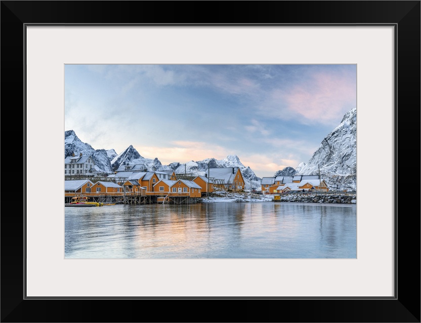 <p>Fishermen's wood cabins covered with snow at sunset in the tiny village of Sakrisoy, Reine, Nordland, Lofoten Islands, Norway, Scandinavia, Europe</p>