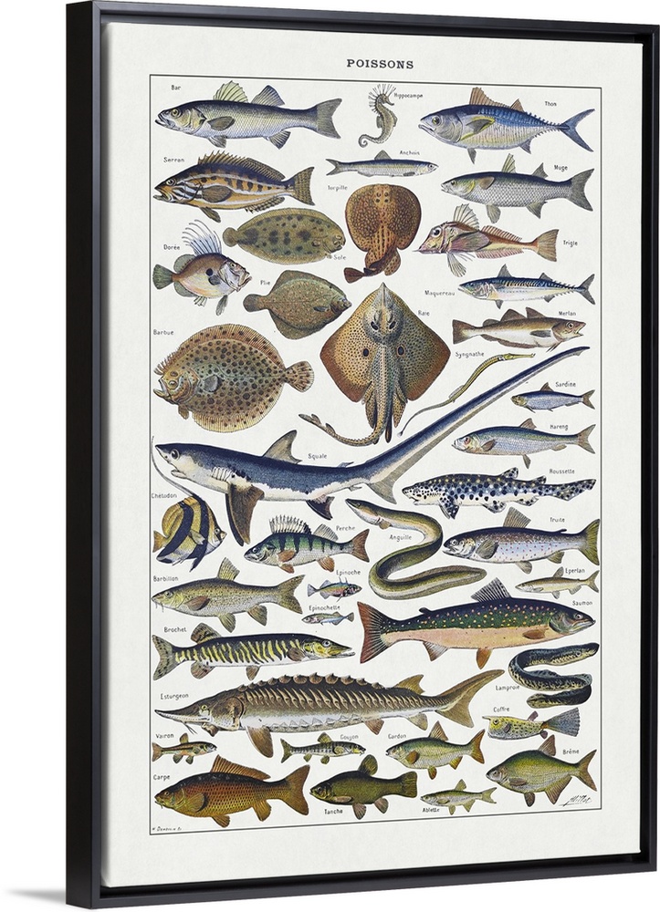 <p>Old illustration about fishes by Adolphe Philippe Millot printed in the french dictionary "Dictionnaire Complet et Illustrate" by the editor Larousse in 1889.</p>