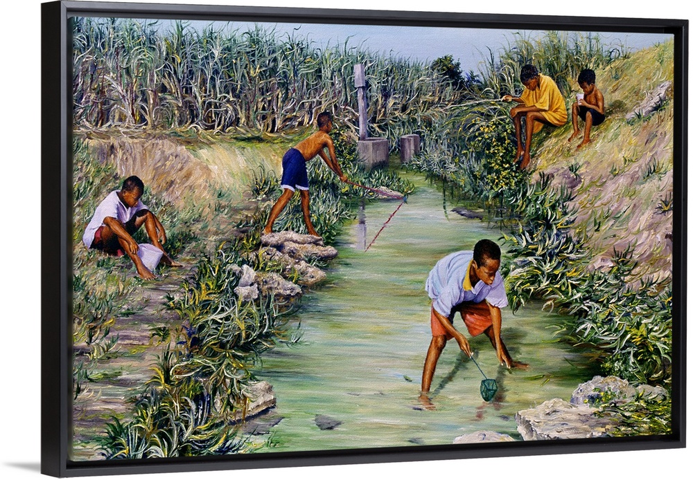 <p>This wall art is a realistic landscape painting African-American art of young men fishing in a stream in Barbados.</p>