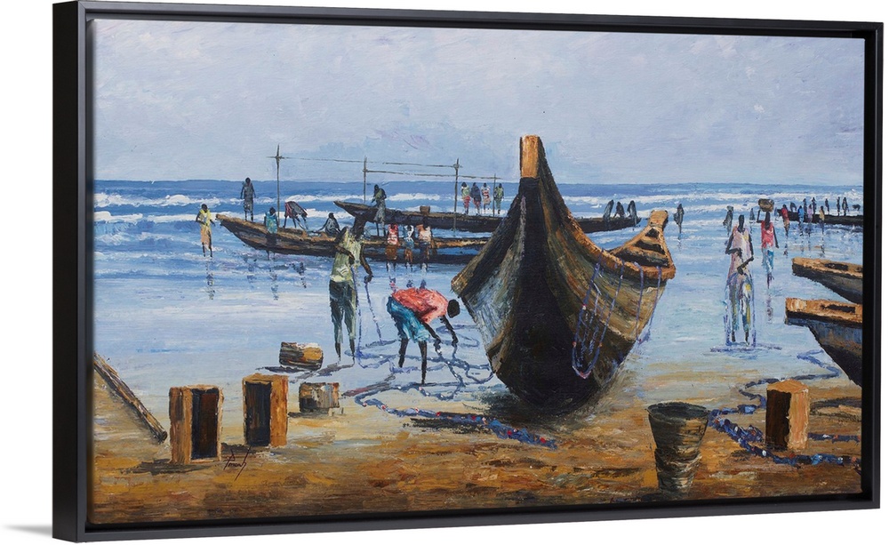<p>Fishermen beach their boats on the sands. After a departure at dawn, they will sell their catch to passersby in time for the family meal. Francis Amoah depicts an everyday scene in clear color, effectively communicating the beauty of honest work. My painting talks about the hardship of fishermen. They sometimes make a large catch and at other times they don't make any catch at all, he says.</p>