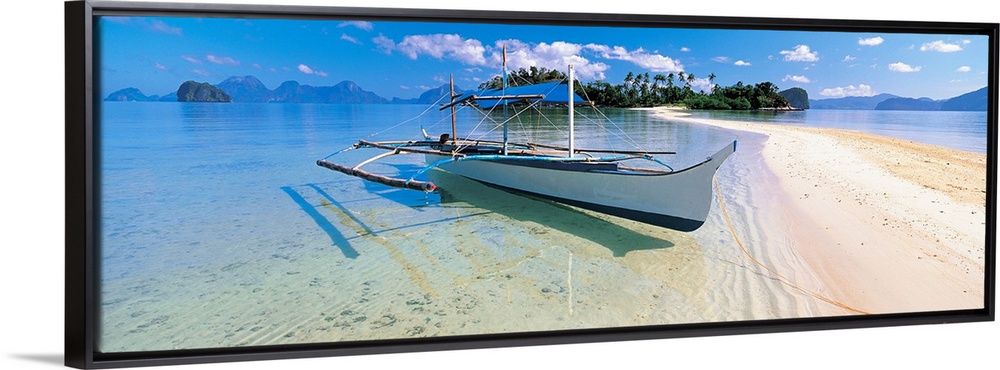 <p>Panoramic photograph displays a fishing vessel as it sits docked on the sandy shores of a coastal region within the Sulu Sea. In the background there are other islands spanning the horizon.</p>