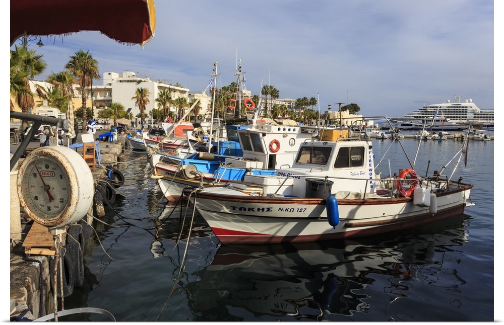 <p>Fishing boats and cruise ship, harbour, Kos Town, Kos, Dodecanese, Greek Islands, Greece</p>