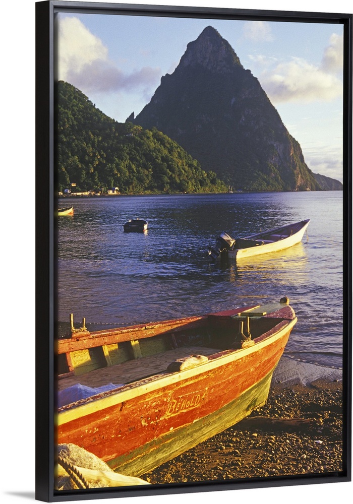 <p>Fishing boats and Petit Piton, Souffriere, St Lucia, Caribbean</p>