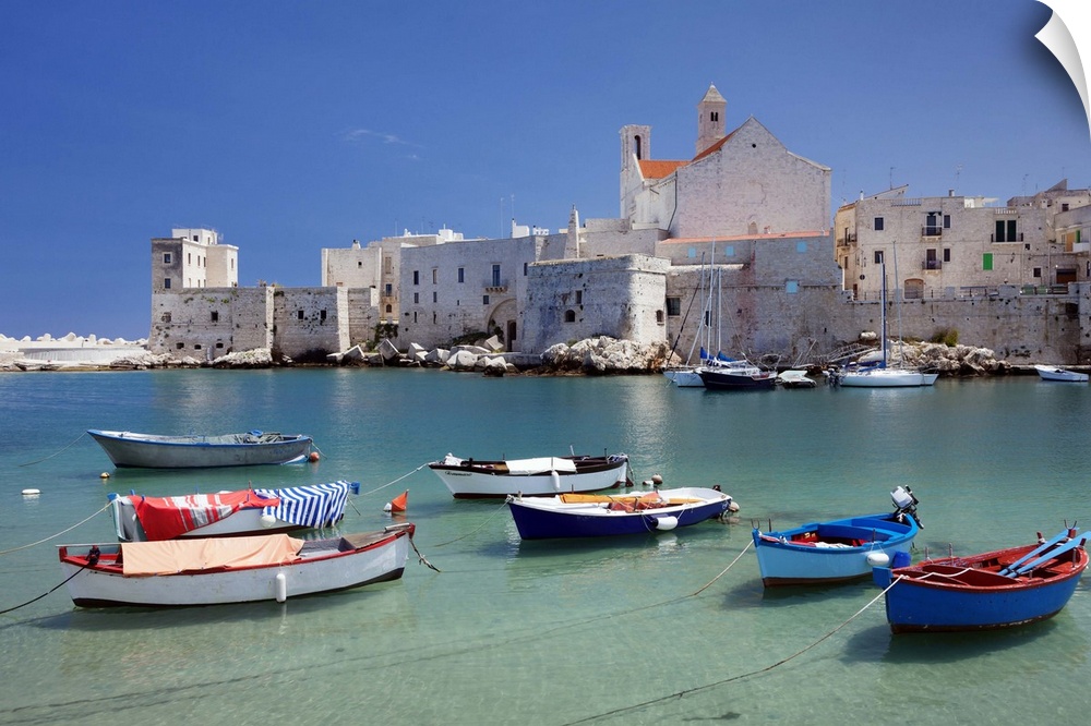 <p>Fishing boats at the harbour, old town with cathedral, Giovinazzo, Bari district, Puglia, Italy, Mediterranean, Europe</p>
