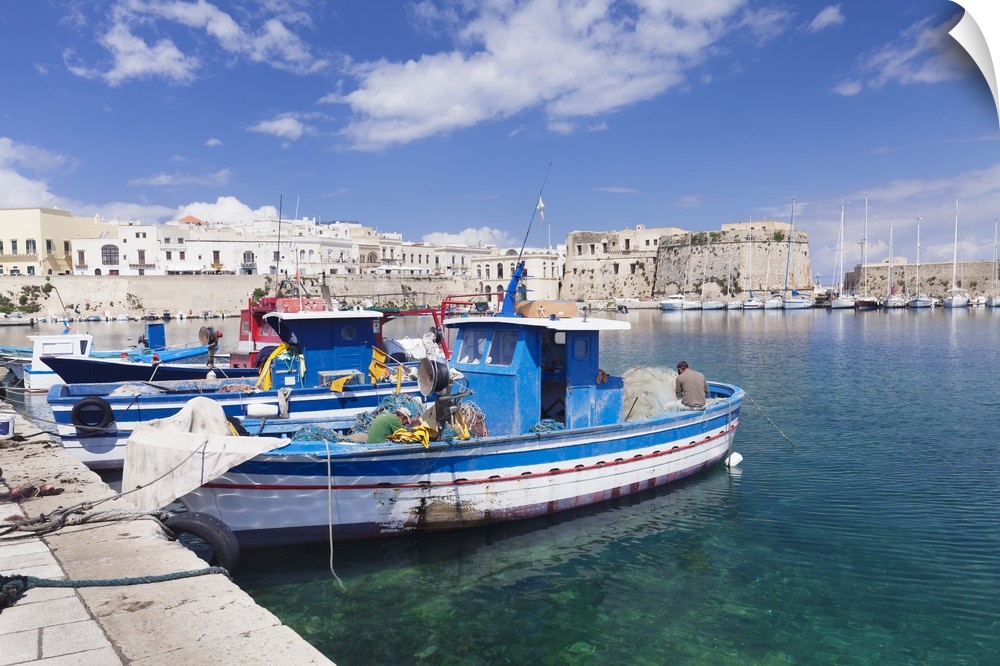 <p>Fishing boats at the port, old town with castle, Gallipoli, Lecce province, Salentine Peninsula, Puglia, Italy, Mediterranean, Europe</p>