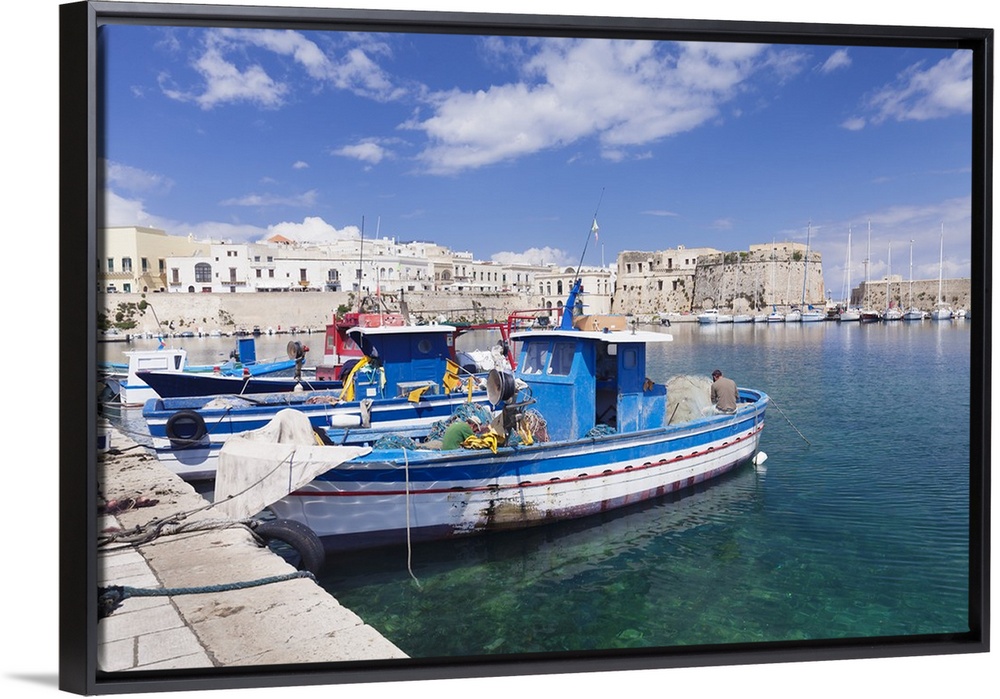 <p>Fishing boats at the port, old town with castle, Gallipoli, Lecce province, Salentine Peninsula, Puglia, Italy, Mediterranean, Europe</p>