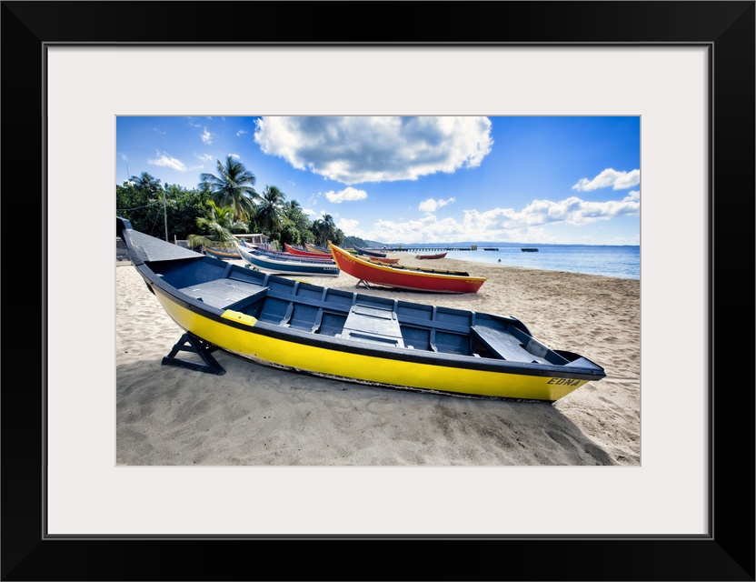 <p>Low angle view of colorful, small wooden, fishing boats on a Caribbean beach, Crash Boat Beach, Aguadilla, Puerto Rico.</p>