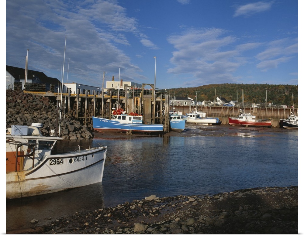 <p>Fishing boats docked at low at in the Bay of Fundy town of Alma, New Brunswick, Canada</p>