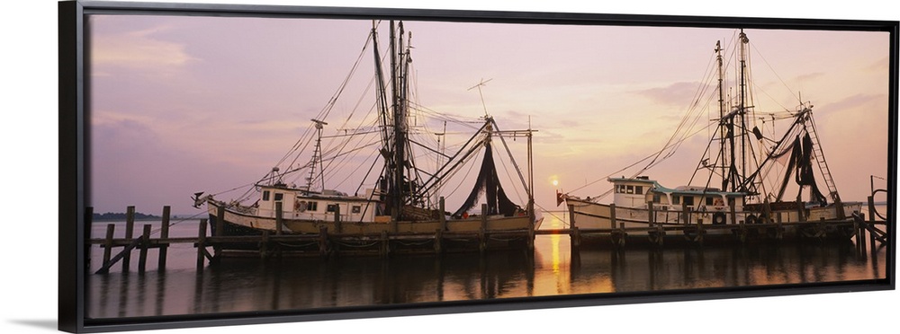 <p>Wide angle photograph of two large fishing boats anchored alongside a dock in the Amelia River, at Fernandina Beach, Florida.</p>