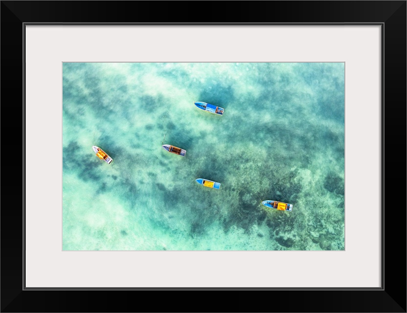 <p>Fishing boats moored in the exotic lagoon, overhead view, Zanzibar, Tanzania</p>
