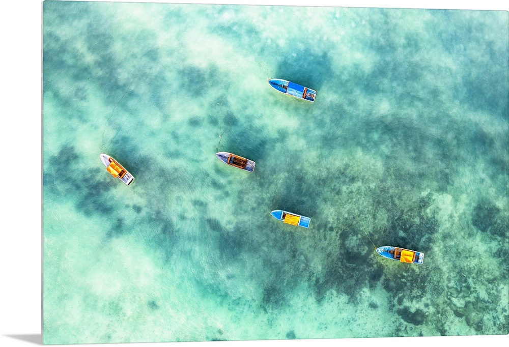 <p>Fishing boats moored in the exotic lagoon, overhead view, Zanzibar, Tanzania</p>