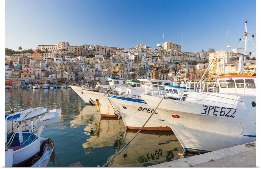 <p>Fishing boats moored in the harbour surrounded by blue sea and the old town, Sciacca, Province of Agrigento, Sicily, Italy</p>