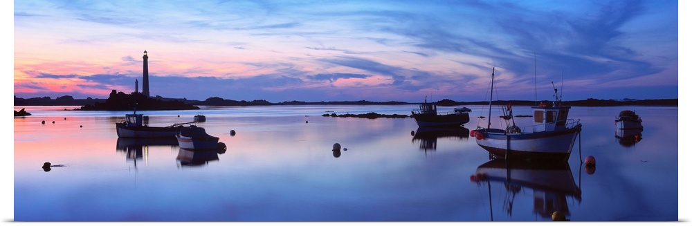 <p>Fishing boats with a lighthouse in the background, Ile Vierge, Plouguerneau, Finistere, Brittany, France</p>