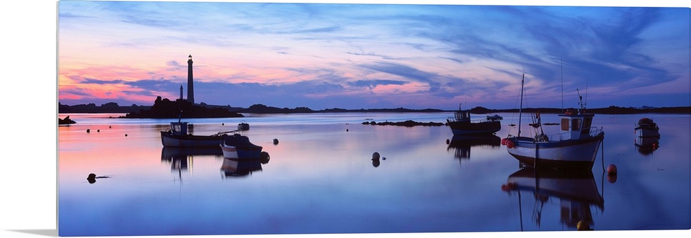 <p>Fishing boats with a lighthouse in the background, Ile Vierge, Plouguerneau, Finistere, Brittany, France</p>