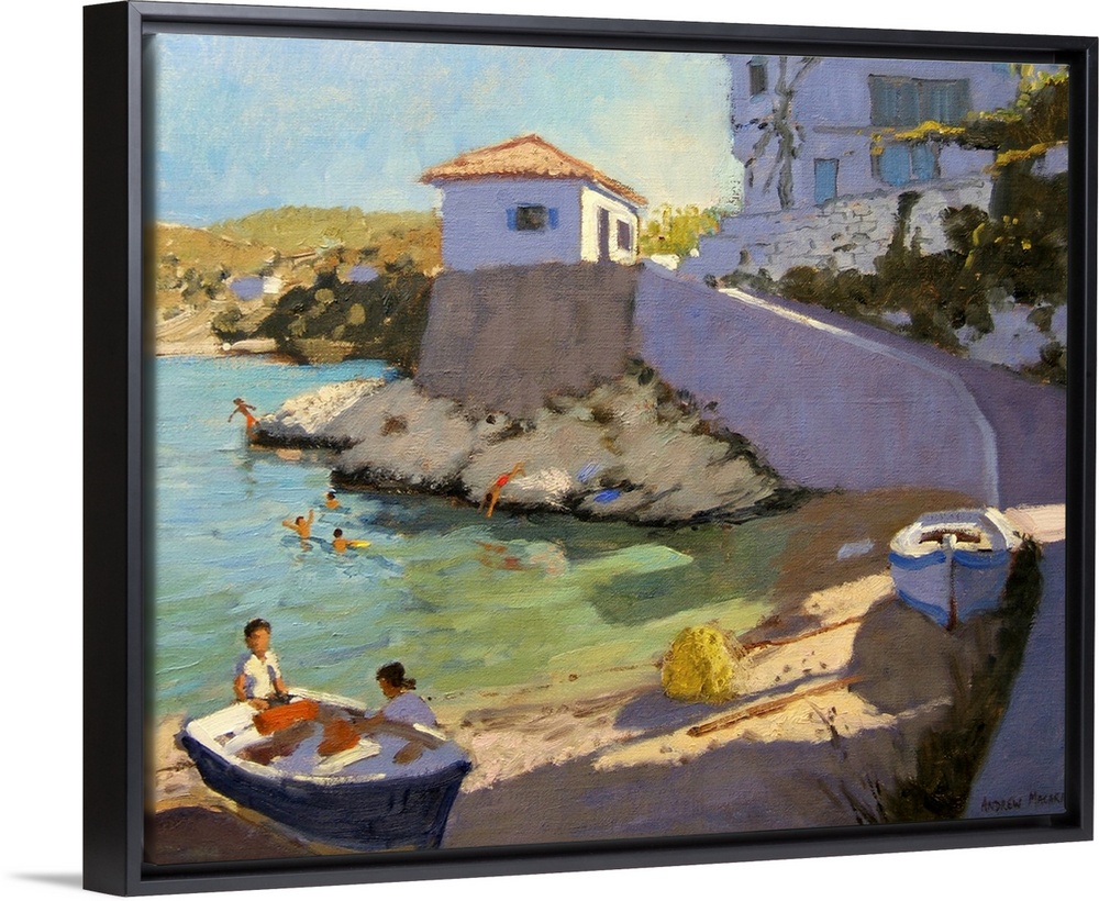 <p>Horizontal, large painting of buildings and a road along a beach, people swimming in the water, and two small boats rest on the beach.</p>