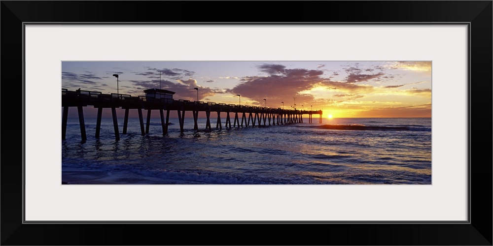 <p>A pier that reaches far out into the ocean is photographed from the beach with the sun just setting on the horizon.</p>