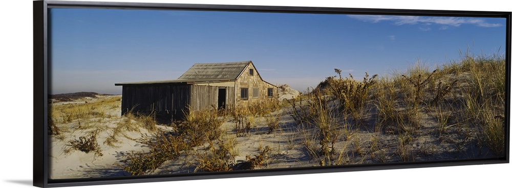 <p>A shack sits on the beach just behind the dunes that are covered with grass.</p>