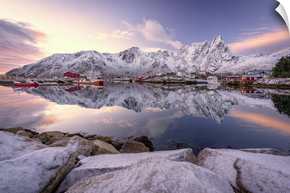 <p>Fishing village of Ballstad and snowy mountains reflected in the sea at dawn, Vestvagoy, Lofoten Islands, Norway</p>