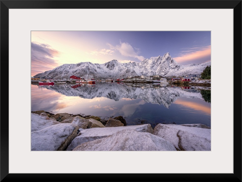 <p>Fishing village of Ballstad and snowy mountains reflected in the sea at dawn, Vestvagoy, Lofoten Islands, Norway</p>