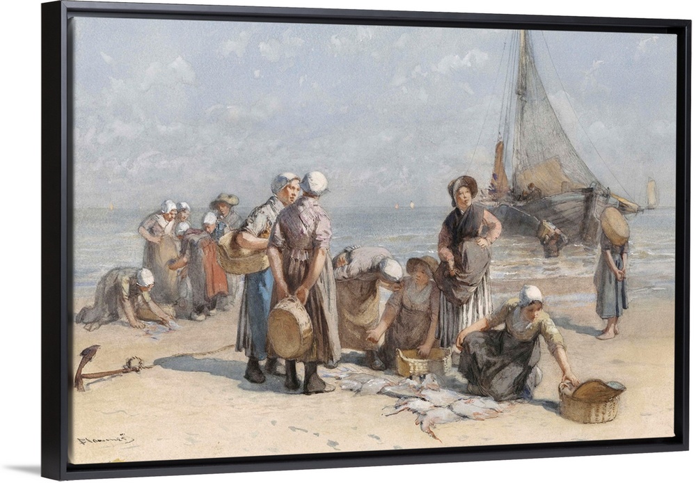 <p>Fishwives on the Beach at Scheveningen, by Bernardus Johannes Blommers, c. 1880-85, Dutch painting, watercolor. Women are sorting the catch before taking it into town in baskets for sale.</p>