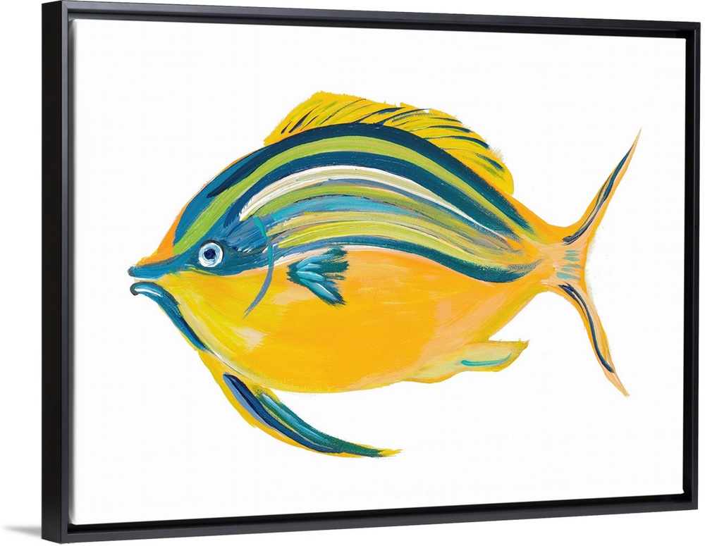 <p>A painting of a yellow, blue, and green fish on a solid white background.</p>