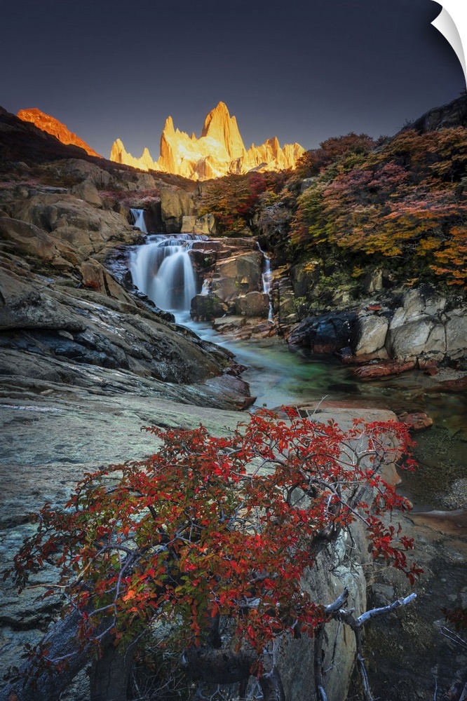 <p>Fitzroy mountain and the Hidden waterfall at sunrise in the Los Glacieres National Park near El Chalten, Patagonia, Argentina</p>