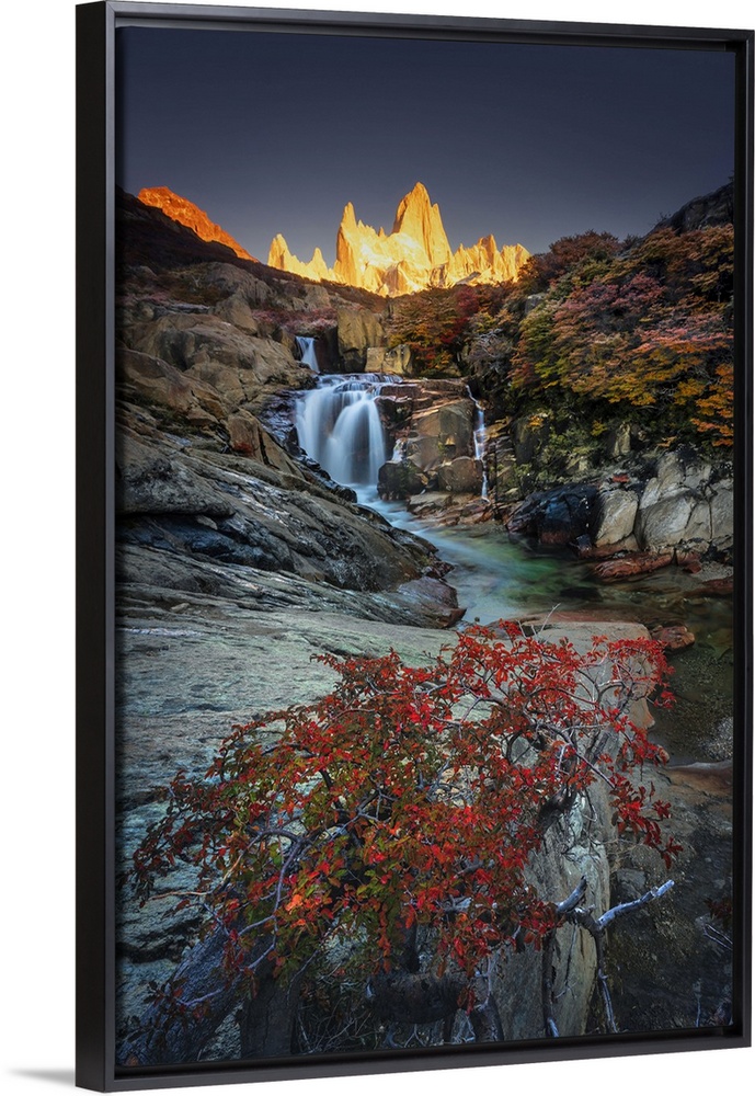 <p>Fitzroy mountain and the Hidden waterfall at sunrise in the Los Glacieres National Park near El Chalten, Patagonia, Argentina</p>