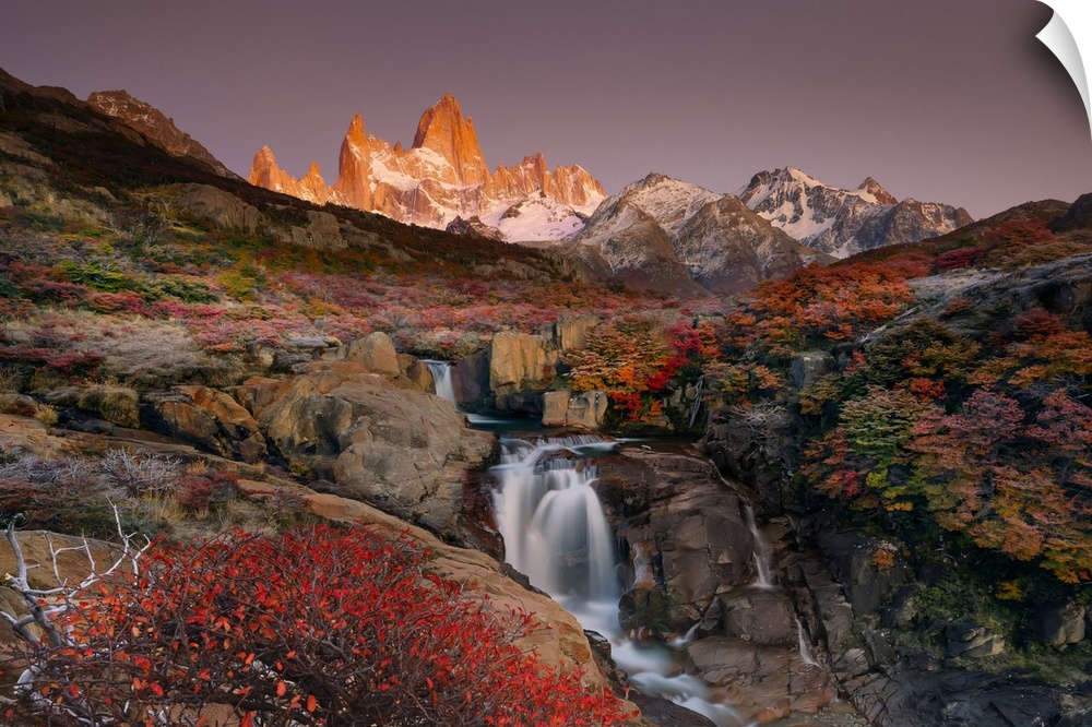 <p>Fitzroy mountain and the Hidden waterfall at sunrise in the Los Glacieres National Park near El Chalten, Patagonia, Argentina</p>