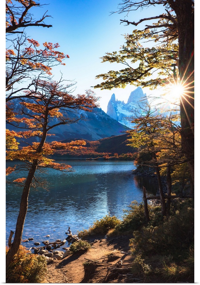<p>Fitzroy mountain at sunset reflecting in the Laguna Capri lake near El Chalten, Patagonia, Argentina</p>