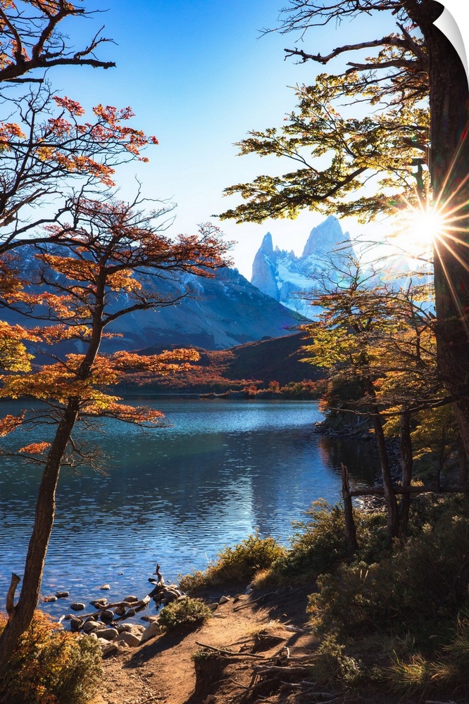 <p>Fitzroy mountain at sunset reflecting in the Laguna Capri lake near El Chalten, Patagonia, Argentina</p>