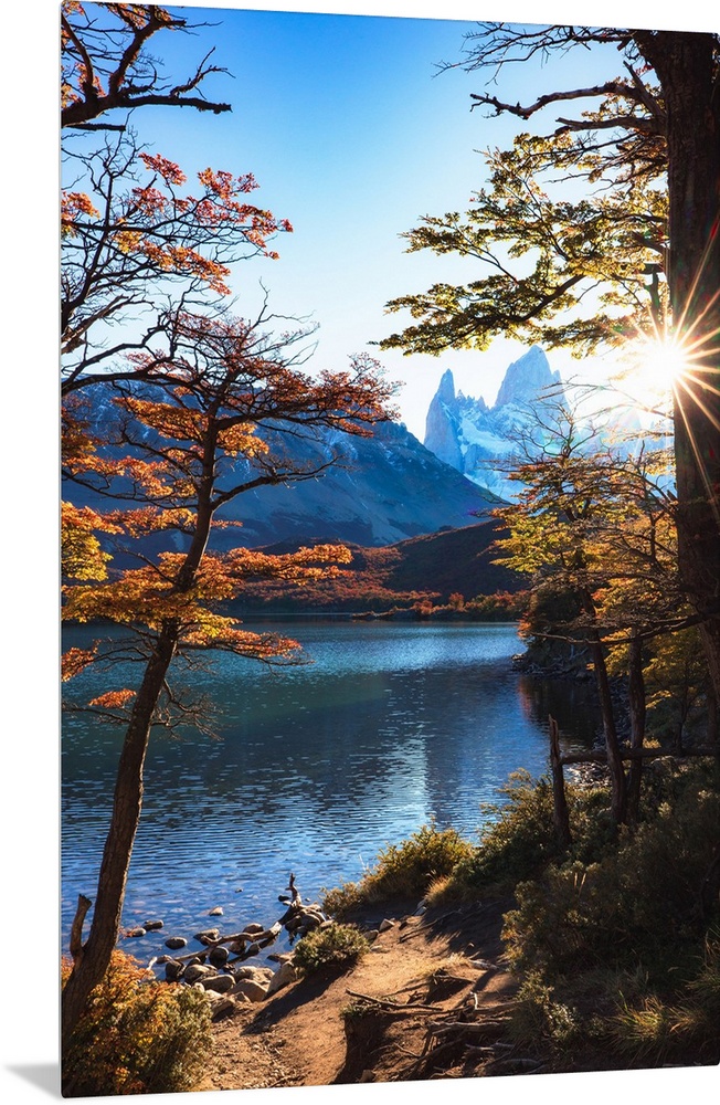 <p>Fitzroy mountain at sunset reflecting in the Laguna Capri lake near El Chalten, Patagonia, Argentina</p>