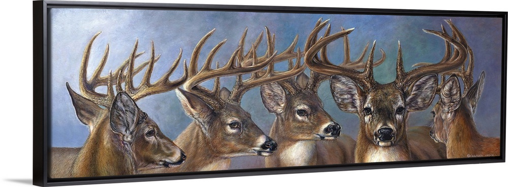 <p>Contemporary painting of five male deer in a row.</p>