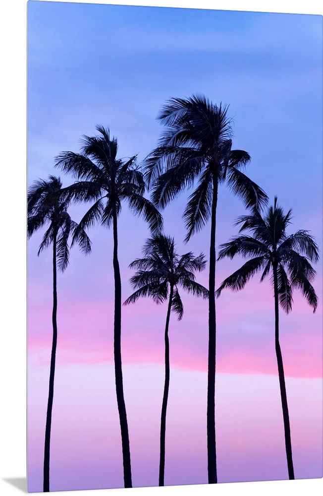 <p>Five coconut palm trees in line with cotton candy sunset behind; Honolulu, Oahu, Hawaii, United States of America</p>