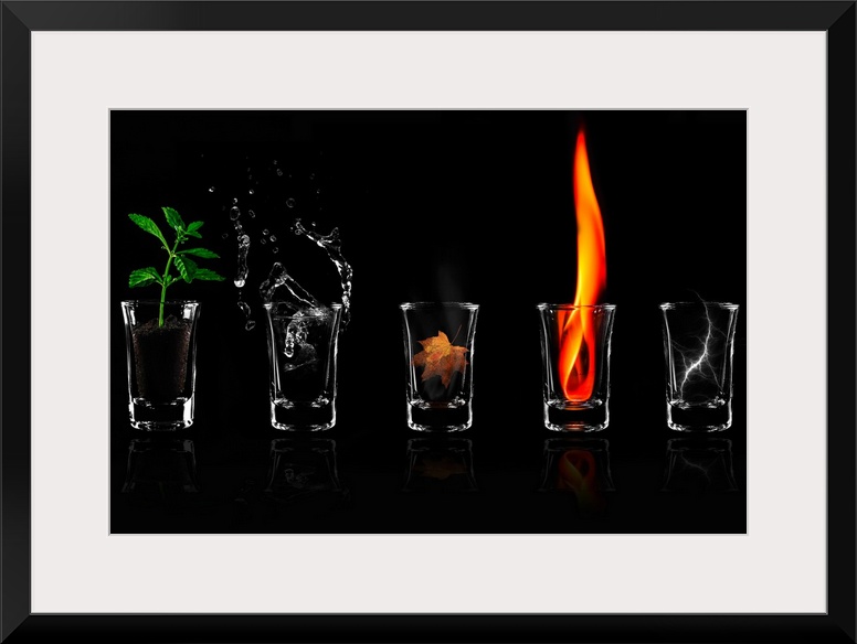 <p>Five shot glasses, each holding an object symbolizing a natural element: earth, water, wood, fire, and air.</p>