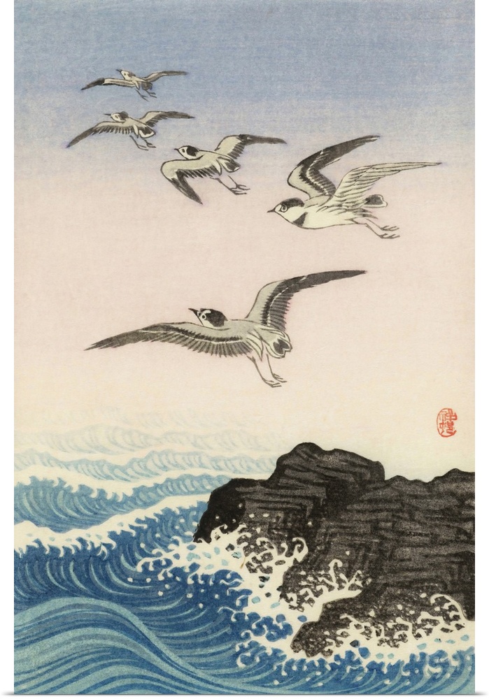 <p>Five Seagulls Above a Rock in the Sea by Japanese artist Ohara Koson, 1877 - 1945. Ohara Koson was part of the shin-hanga, or new prints movement.</p>