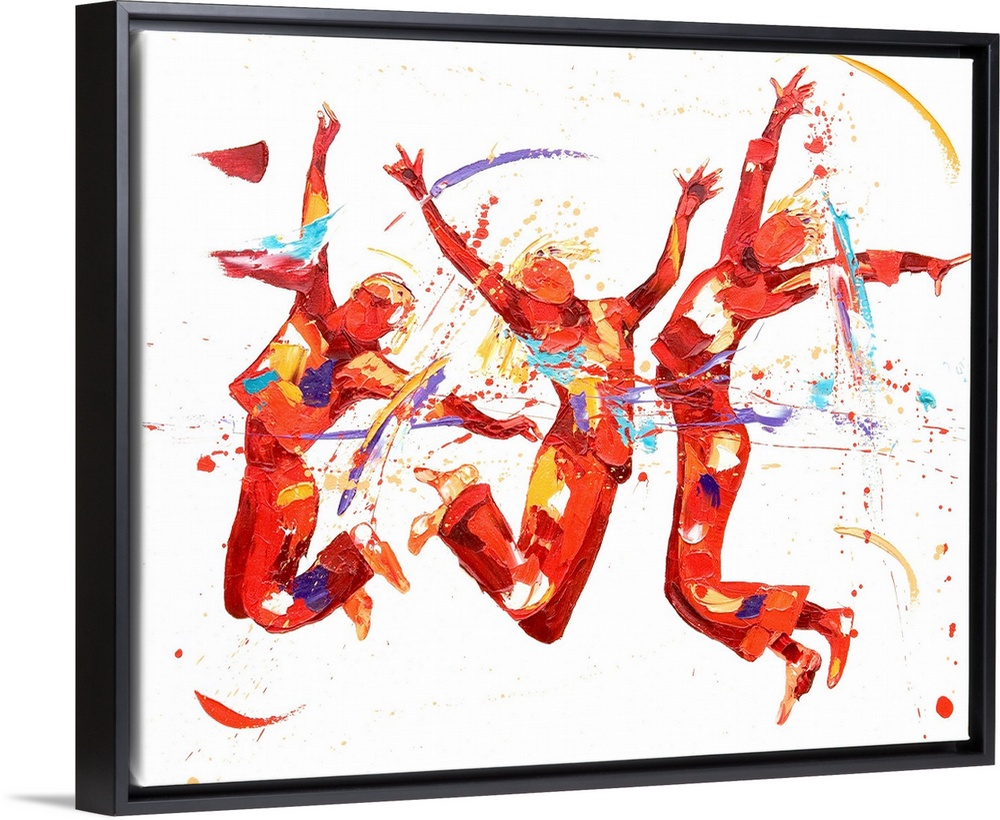 <p>Contemporary painting of figures leaping into the air and dancing.</p>