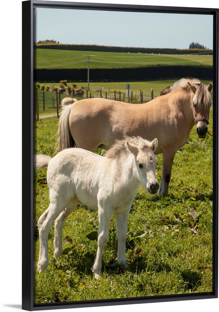 <p>Norwegian fjord horse, mare and foal, rare horse breed, only breeding stud in New Zealand, Timaru</p>