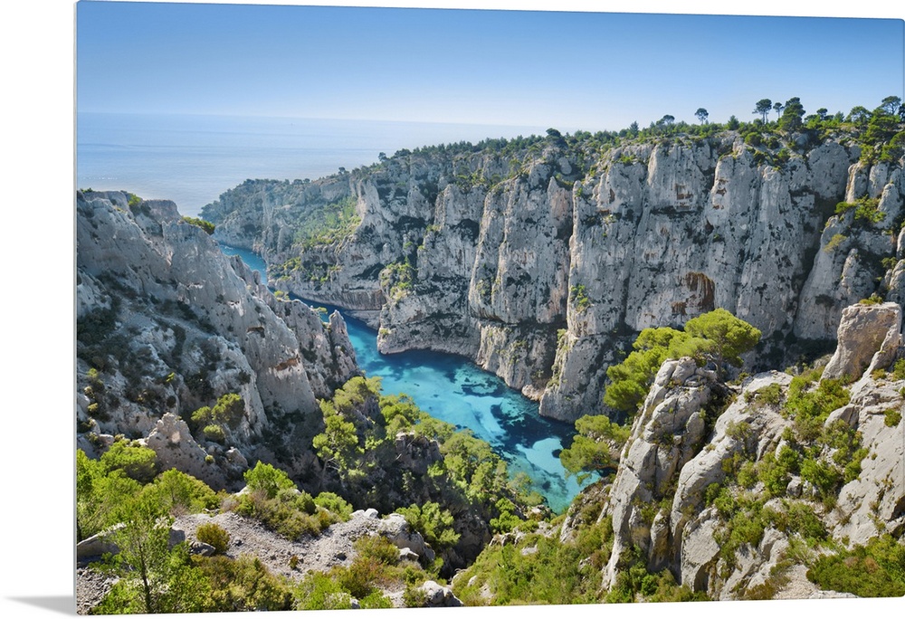 <p>Fjord landscape in the Calanques. France, Provence-Alpes-Cote d'Azur, Bouches-du-Rhone, Cassis, Calanque d'en Vau. Cote d'Azur, Calanques. Cote D'Azur, Western Europe, France.</p>