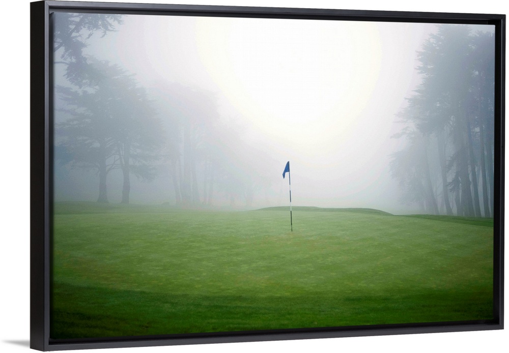 <p>Flag on putting green on golf course, fog and trees in background</p>