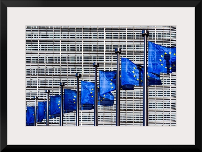 <p>Flags of European Union weaving outside the European Commission building, Brussels, Belgium</p>