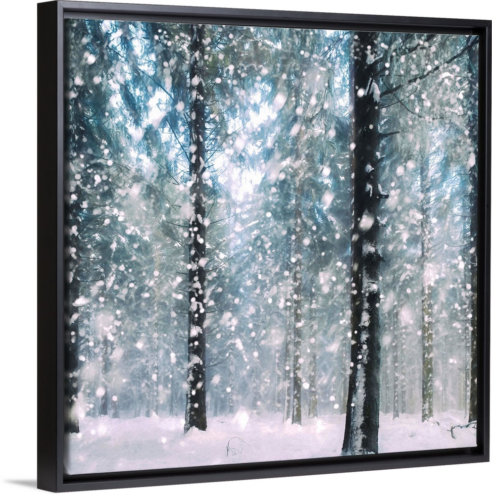 <p>Square image of a forest in the winter with large snowflakes falling on the ground.</p>