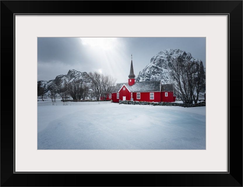 <p>A photograph of red church seen in a wintry landscape.</p>