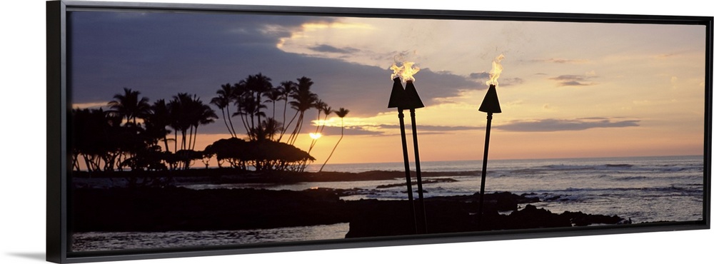 <p>Panoramic photograph of silhouetted palm trees and land reaching into dark waters beneath the setting sun. Several lit torches in the foreground, in Fairmont Orchid, Hawaii.</p>