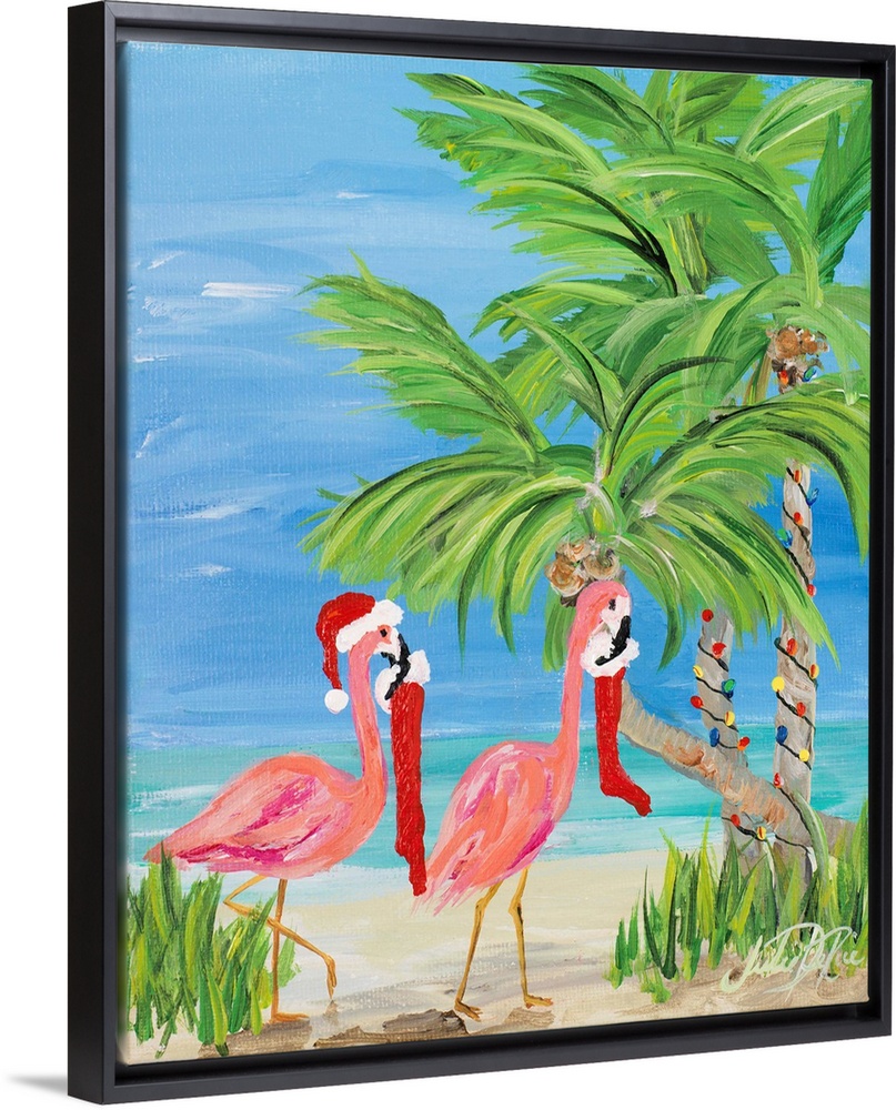 <p>Fun tropical Christmas themed painting of two pink flamingos carrying stockings in their beaks to a palm tree decorated with Christmas lights.</p>
