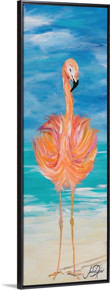 <p>Contemporary painting of a pink flamingo standing on a beach with the ocean in the background.</p>