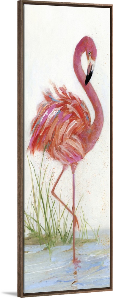 <p>Tall contemporary painting of a pink flamingo standing on one leg in water.</p>