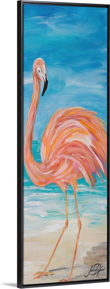 <p>Contemporary painting of a pink flamingo standing on a beach with the ocean in the background.</p>