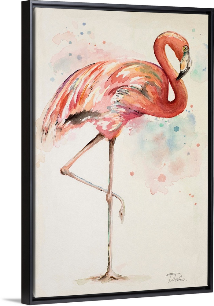 <p>Painting of a pink flamingo with long legs on a beige background.</p>