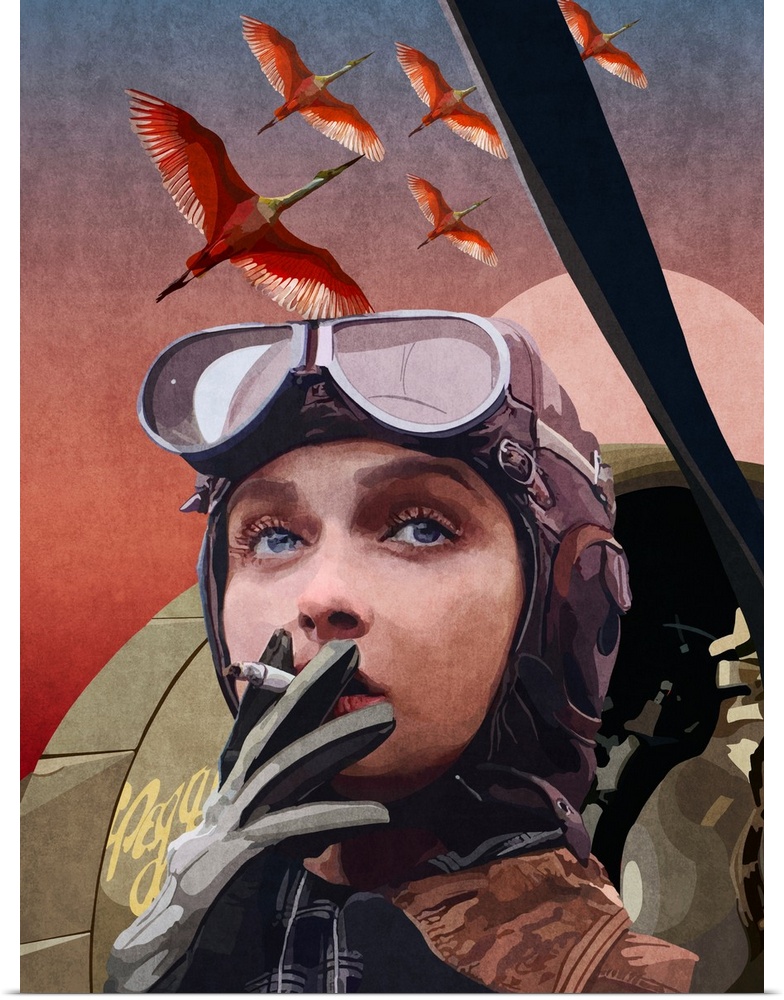 <p>A retro style illustration of a female aviator smoking a cigarette in front of a vintage aircraft with a flock of flamingoes flying overhead.</p>